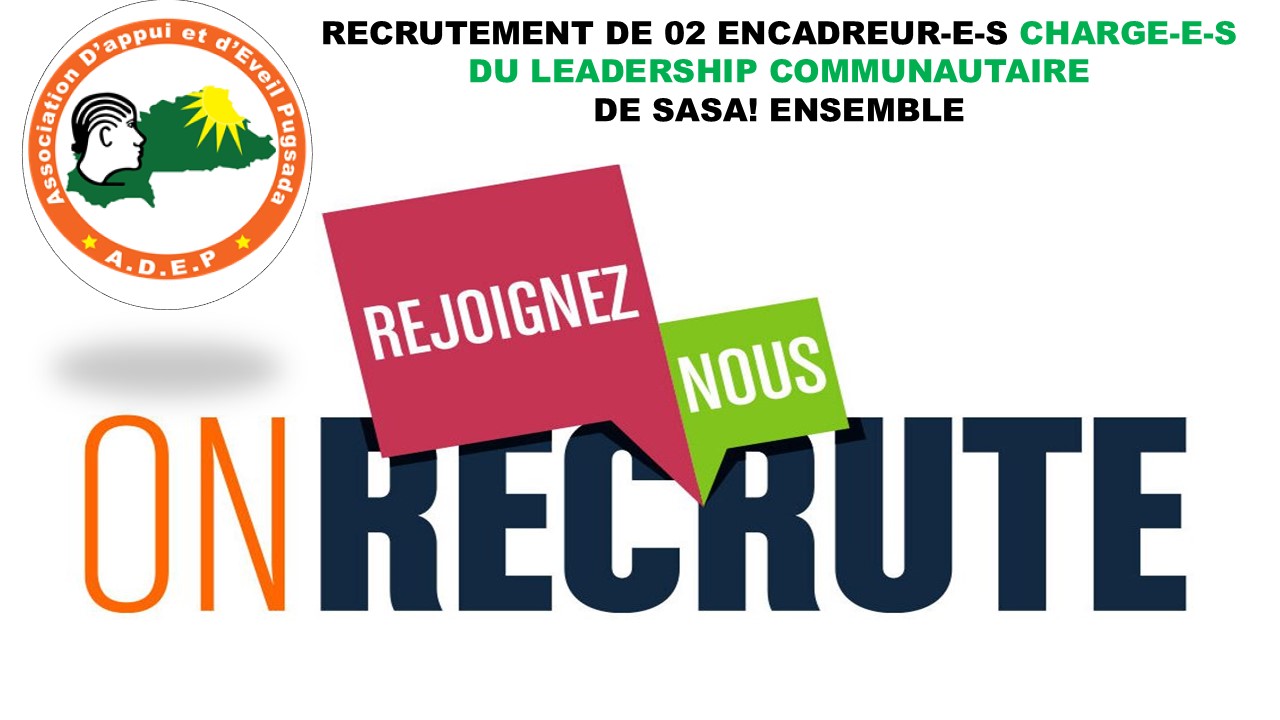 Postes : 02 encadreur-e-s chargé-e-s du leadership communautaire, Lieux d’affectation : la région du Kadiogo, province du Kadiogo, commune de Ouagadougou, quartiers Zagtouli et Zongo. Date de prise de fonction souhaitée
