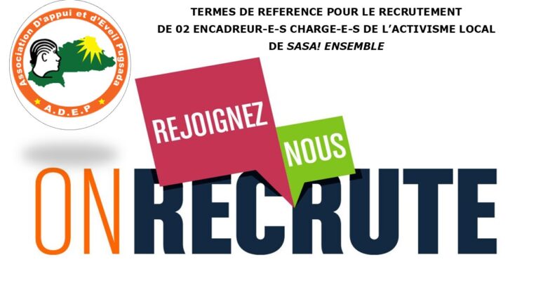 Il est recherché deux (02) encadreur-e-s soit un homme et une femme, chargé de l’activisme local. Il doivent :